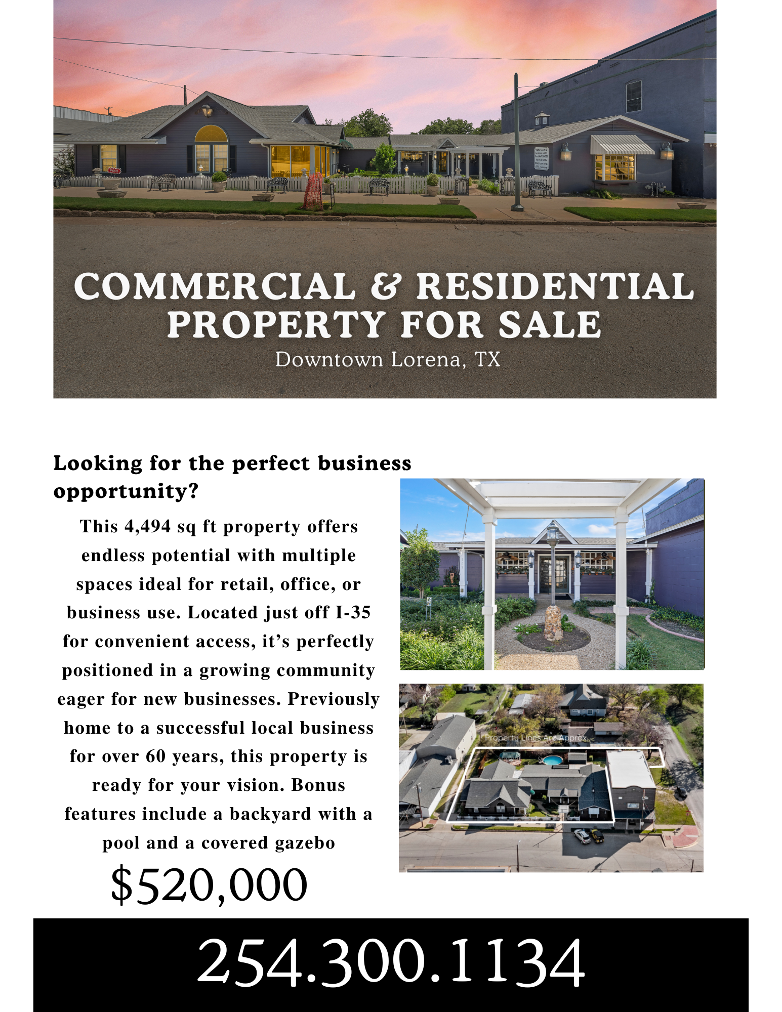 Great opportunity in historic Downtown Lorena!  This 4,494 sq ft property offers endless potential with multiple spaces ideal for retail, office, or business use.  Located just off I-35 for convenient access, it's perfectly positioned in a growing community eager for new businesses.  Previously home to a successful local business for over 60 years, this property is ready for your vision.  Bonus features include a backyard with a pool and covered gazabo - perfect for relaxing evenings and beating the Texas heat.  Don't miss out - schedule your private showing today!  254.300.1134