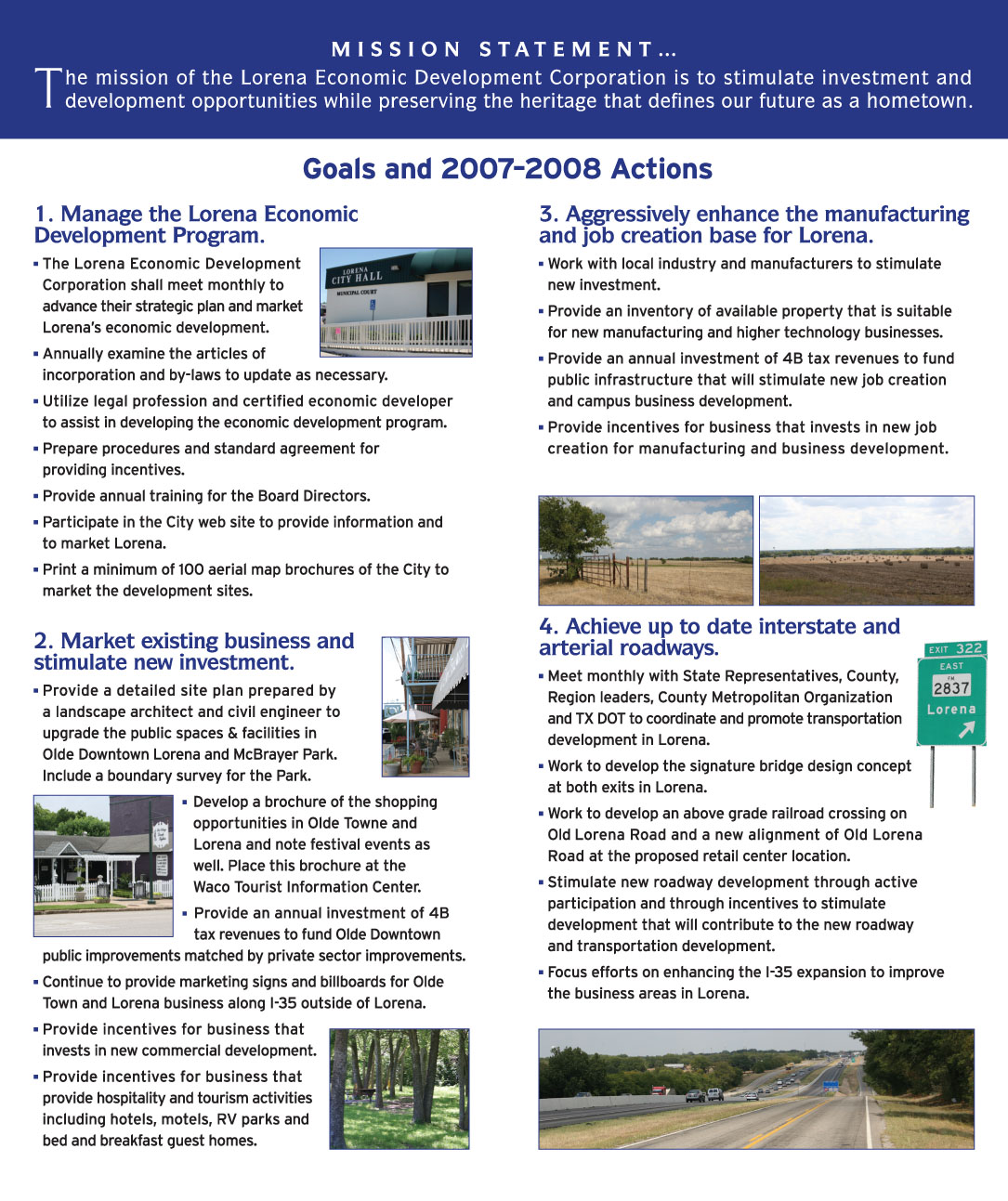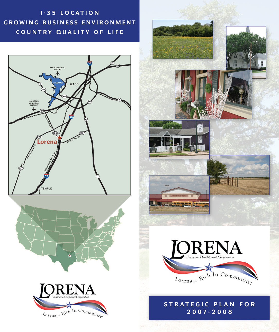 The corporation anticipates annual updates and revision of priorities as projects are accomplished and development occurs. This strategic plan is developed from a visioning survey of the city business and community leaders as well as city citizens. The plan is also developed from research conducted to identify the available land inventory and economic facts and features of Lorena that makes ...Lorena - Rich in Community!